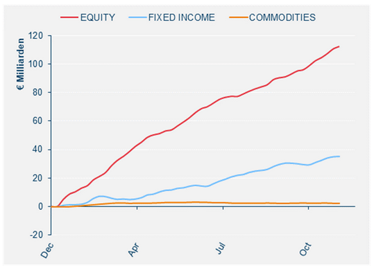 Die Verbreitung der Omikron-Virusvariante wurde vor allem auf dem europäischen ETF-Markt als Verkaufssignal gewertet. Insgesamt waren die monatlichen Flows in Aktien-ETFs in Europa mit 8,0 Mrd. EUR zwar positiv, in der letzten Novemberwoche flossen aus Aktien-ETFs jedoch 2,2 Mrd. Euro ab.
