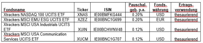 Ausserdem wurden heute zwei ETFs auf US-Aktiensektoren an der Deutschen Börse gelistet, der Xtrackers MSCI USA Industrials UCITS ETF und der Xtrackers MSCI USA Communication Services UCITS ETF.