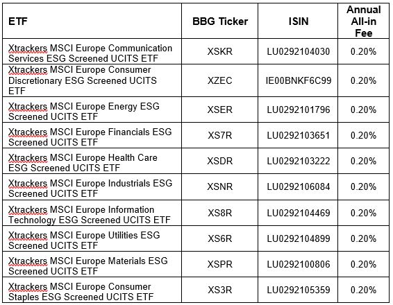 Entsprechend wurden die Namen der ETFs geändert. Zusammen mit der im Juni 2021 erfolgten Auflage des Xtrackers MSCI Europe Consumer Discretionary ESG Screened UCITS ETF verfügt Xtrackers nun über eine Palette von zehn ESG-Screened Sektor-ETFs für den europäischen Aktienmarkt, die einen MSCI-Index physisch replizieren (Details in der Tabelle unten).