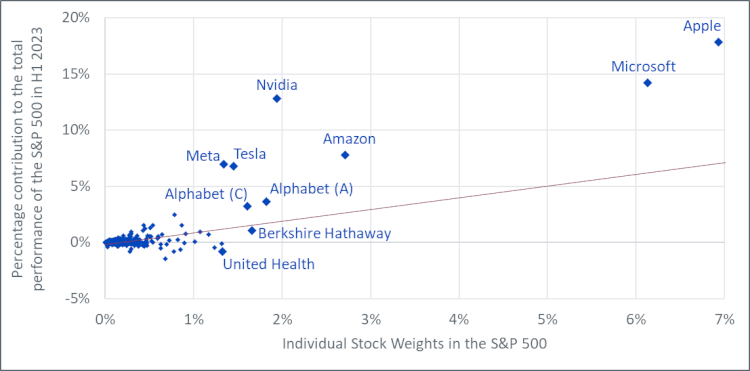 Abbildung 3: Gewichtung und Beitrag zur Performance der einzelnen Aktien des S&P 500 im ersten Halbjahr 2023