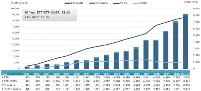 ETFGI reports assets in the global ETFs and ETPs industry broke through the US$ 9 trillion milestone at the end of May 2021
