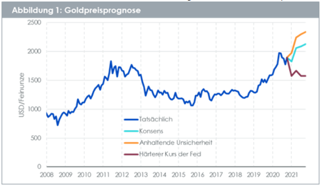 Mithilfe unseres Modellrahmens arbeiten wir einige Szenarien für die Goldpreise bis ins vierte Quartal 2021 aus.