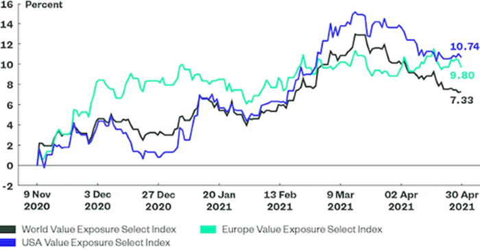 Die Value Exposure Select-Indizes verfolgen einen sektor-neutralen Ansatz, was bedeutet, dass der Großteil der relativen Outperformance gegenüber der Marktbenchmark aus der Auswahl günstiger Aktien stammt, die vom Reflationstrade profitieren. So verteilte sich die 7,33 prozentige Outperformance des MSCI Value Exposure Select Index (im Vergleich zur Benchmark MSCI World Index) auf eine Vielzahl von Sektoren. Der Selektionseffekt war für eine geschätzte Outperformance von 2,51 Prozent bei Technologie, 1,02 Prozent bei Basiskonsumgütern und jeweils 0,93 Prozent bei Material-, Industrie- und Konsumgütern verantwortlich.[2]