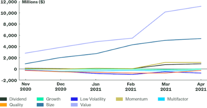 Europäische ETF-Anleger haben seit November letzten Jahres eine beträchtliche Menge an Geld in Value-fokussierte Smart-Beta-ETFs investiert (siehe Abbildung 2). Anleger, die das Gefühl haben, den Handel verpasst zu haben, könnten den kleinen Pullback im April als Gelegenheit sehen, im Mai Geld in Value-Aktien zu investieren, wenn sich der Reflationshandel den Sommermonaten 2021 nähert.