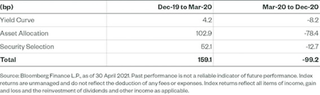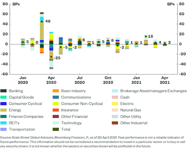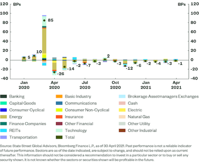 Seit März gab es eine gewisse „Entschädigung“, da die Wertpapierauswahl die relative Performance des Bloomberg SASB US Corporate ESG Ex-Controversies Select Index belastete. Dieser Effekt war jedoch bescheiden, da die Wertpapierauswahl nur -12,7 Basispunkte zum ESG-Index beigetragen hat und damit weit davon entfernt ist, die während der Krise erzielten Gewinne wieder aufzuholen. In der Tat war der einzige Monat, in dem es zu einer signifikanten Belastung kam, der April 2020, während der unmittelbaren Erholung von der Krise.