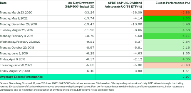 Dividenden-Aristokraten bieten nicht nur ein Engagement im Value-Trade, sondern können auch sehr defensiv sein. Aktien von Dividenden-Aristokraten haben in der Regel ein geringeres Beta, was in Zeiten eines schnellen Marktrückgangs einen gewissen Schutz bieten kann. Seit Mitte 2015 – sechs Monate vor dem Zinserhöhungsprogramm der Fed – hat der S&P 500® Index innerhalb von 30 Tagen elf Rückschläge von mehr als fünf Prozent erlebt. In neun der elf Rückschläge hat der SPDR® S&P® U.S. Dividend Aristocrats UCITS ETF (Ticker: SPYD) Schutz durch Überrenditen geboten (siehe Abbildung 2).