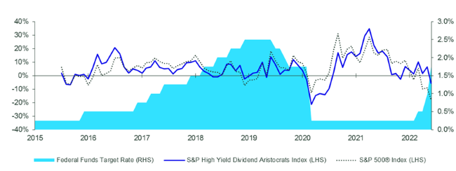 Der Anstieg der Zinssätze wirkt sich auf die Aktienkurse aus, indem er die Bewertungsprämie für künftige Gewinne drückt. Dies wirkt sich häufig stärker auf Wachstumswerte aus, da diese in der Regel mit höheren Kurs-Gewinn-Verhältnissen gehandelt werden. Während die Fed ihre Absicht, die Zinssätze zu erhöhen, deutlich gemacht hat, hat diese Politik die relative Performance von Value-Aktien, einschließlich Dividenden-Aristokraten, begünstigt. Ähnlich wie in der ersten Jahreshälfte 2015, als die Fed das letzte Mal ein Zinserhöhungsprogramm einleitete, hat sich der S&P High Yield Dividend Aristocrats® Index in den ersten sechs Monaten des Jahres 2022 besser entwickelt als der S&P 500® Index (siehe Abbildung 1).