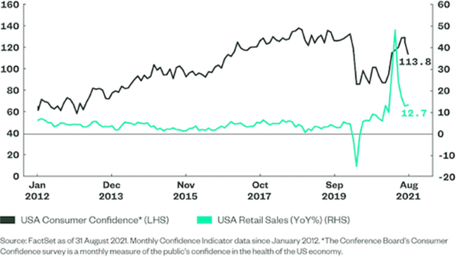 Die derzeitige wirtschaftliche Stimmung ist nach wie vor ein gutes Argument für Investitionen in die Aktienmärkte. Die Umfragen zum Verbrauchervertrauen und zu den Einzelhandelsumsätzen haben ihre Trends aus der Zeit vor der Pandemie wieder aufgenommen (Abbildung 2), da die Verbraucher darauf hoffen, die pandemiebedingten Restriktionen hinter sich zu lassen und zur Normalität zurückzukehren. Wir sehen Anzeichen für dieses Vertrauen in den Erwartungen für Dividendenzahlungen. In unserem aktualisierten Insights-Artikel, USA Dividend Aristocrats: Playing the Continued Recovery“ heben wir hervor, dass sowohl die Erwartungen der Analysten als auch die Dividendenprognosen derzeit bemerkenswert positiv sind.