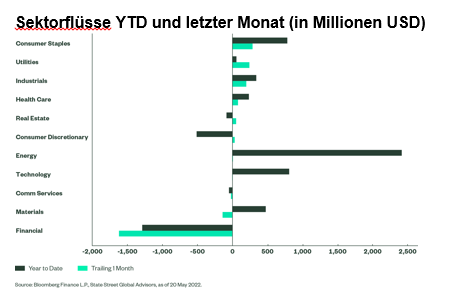 In diesem Jahr stechen bisher zwei Sektoren bei der Entwicklung der Mittelzuflüsse hervor. Der Energiesektor hat Woche für Woche beträchtliche Nettozuflüsse zu verzeichnen, die im Verhältnis zur Marktkapitalisierung des Sektors viel größer sind als in jedem anderen Sektor. Der Finanzsektor (einschließlich der stark gehandelten börsengehandelten Bankenfonds) hingegen verzeichnete in den ersten sechs Wochen des Jahres starke Nettozuflüsse, dann eine rasche Trendwende und seitdem erhebliche Abflüsse. Beide Trends sind auf den starken Einfluss makroökonomischer Faktoren auf den heutigen Aktienmarkt zurückzuführen.