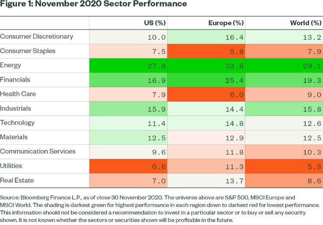 Alle Sektoren legten bei starken Aktienmärkten im November zu, aber ab dem 9. November gab es eine starke Veränderung der relativen Performance. An jenem Montagmorgen erfuhren die Aktienmärkte, dass Joe Biden wahrscheinlich die US-Präsidentschaft gewonnen hatte, wenn auch ohne die erwartete blaue Welle, die eine progressivere Politik wie Unternehmenssteuererhöhungen und eine Gesundheitsreform hätte bringen können.