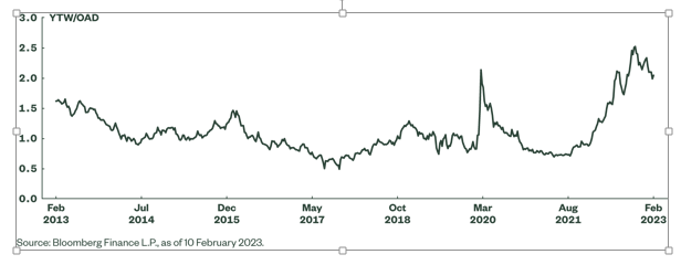Abbildung 1 zeigt die Rendite auf den schlechtesten Wert des Bloomberg Liquidity Screened Euro HY Index geteilt durch seine optionsbereinigte Duration. Die Kombination aus dem Anstieg der Renditen in Verbindung mit kürzeren Laufzeiten (sowohl aufgrund des Ausverkaufs von Anleihen als auch aufgrund der begrenzten Primäremissionen im Jahr 2022, was bedeutet, dass sich die Indexlaufzeit verkürzt hat) hat dazu geführt, dass die Rendite pro Jahr der Duration auf über zwei gestiegen ist. Renditen von mehr als 2 % pro Durationsjahr waren in den letzten zehn Jahren selten und erreichten bis vor kurzem nur auf dem Höhepunkt der COVID-Panik dieses Niveau.