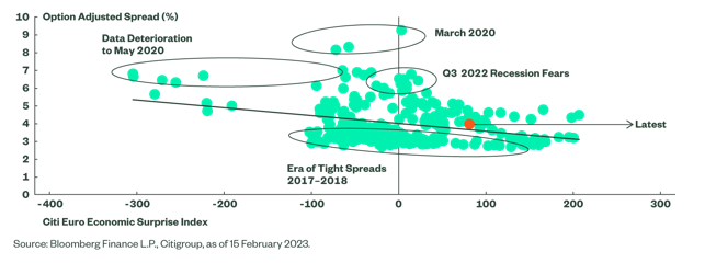 Anders ausgedrückt: Der Markt hat eine weitaus aggressivere Verlangsamung der Wirtschaftstätigkeit eingepreist, als tatsächlich eingetreten ist. Dies spiegelt sich immer noch im aktuellen Niveau der Spreads wider, die im Verhältnis zur Stimmung etwas weit erscheinen und Spielraum für eine Verengung haben, wenn die Konjunktur weiterhin lebhaft bleibt und sich die Risikobereitschaft des Marktes stabilisiert.