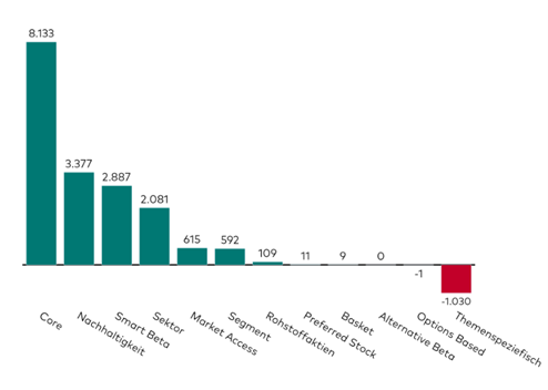 Quelle: ETFbook; Stand: 30. September 2024. Zur „Segment“-Kategorie gehören Aktien-ETFs auf bestimmte Marktkapitalisierungssegmente wie Small Cap, Mid Cap und Large Cap. „Market Access“-ETFs investieren in schwer zugängliche Märkte wie Schwellenländer. Die „Basket“-Kategorie umfasst Strategien, die mehrere Aktien als Basiswerte kombinieren, z. B. FAANG-Aktien.