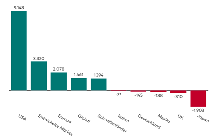 Auf regionaler Ebene führten erneut ETFs auf Aktien aus den USA sowie aus Industrieländern das Feld an und kamen im September auf Zuflüsse in Höhe von 9,1 bzw. 3,3 Mrd. USD. Andere Länder-ETFs waren dagegen wenig gefragt: Bei Aktien-ETFs aus Japan, UK, Mexiko, Deutschland und Italien kam es zu Nettoabflüssen.