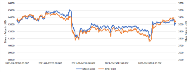 Angesichts der Nachrichten vom 24. September 2021 erlebten die wichtigsten Kryptowährungen einen Rückschlag: Bitcoin (BTC) und Ether (ETH) verloren rund 10 Prozent, und der allgemeine Markt fiel innerhalb von 4 Stunden von zwei Milliarden US-Dollar auf 1,8 Milliarden US-Dollar4. Die Preise stabilisierten sich jedoch schnell bei 43.000 US-Dollar für BTC und 2.900 US-Dollar für ETH und begannen dann wieder zu steigen.