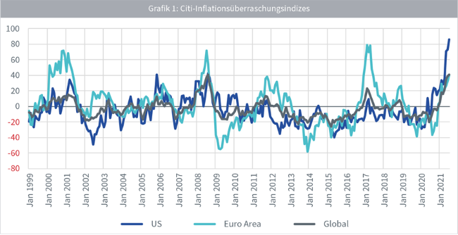 Das Thema der anziehenden Inflation begleitet uns schon seit geraumer Zeit. Dessen ungeachtet scheint der Markt davon überrascht worden zu sein. In Grafik 1 ist ein „Inflationsüberraschungsindex“ dargestellt, also das Ausmaß, in dem die tatsächliche Inflationsentwicklung über den Markterwartungen lag. Für die USA ist der aktuelle Wert der höchste der bisher erfassten Datenreihe. Im Euroraum mag es in der Vergangenheit zwar bereits größere Überraschungen gegeben haben, doch geht auch hier der Index nach oben. Auf globaler Ebene liegt der Index nur knapp unter dem Allzeithoch des Jahres 2008 und könnte in den kommenden Monaten auf ein neues Rekordniveau steigen.