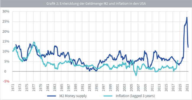 Abgesehen von der durch den Schock auf der Angebotsseite ausgelösten Inflation gibt es aus unserer Sicht weitere Inflationsfaktoren. Anhänger von Milton Friedmans These, wonach „Inflation immer und überall ein rein monetäres Phänomen“ sei1, sollten daher einen genaueren Blick auf die nachstehende Grafik 2 werfen. Die Inflation ist dem Wachstum der Geldmengen häufig mit einem gewissen Nachlauf gefolgt. Der in den Jahren 2020 und 2021 verzeichnete Anstieg der Geldmenge M2 ist enorm. Eine Welt, in der dies nicht zu einem gewissen Inflationsdruck führte, ist kaum vorstellbar. Kritiker verweisen oft auf den Zeitraum von 2009 bis 2012, in dem es beim Geldmengenwachstum zu einigen Ausschlägen kam, ohne dass damit ein Anstieg der Inflation einherging. Allerdings war das auch exakt der Zeitraum der globalen Finanzkrise und der europäischen Staatsschuldenkrise, als das Bankensystem seinen Zusammenbruch erlebte. Damals emittierten die Notenbanken zwar große Geldmengen, doch parkten die Geschäftsbanken genau diese Gelder als Rücklagen bei der jeweiligen Zentralbank. Dieses Phänomen kommt jedoch aktuell nicht zum Tragen. Da die Geschäftsbanken ihre Stresstests mit Bravour bestehen, rechnen wir derzeit nicht mit Störungen bei der Kreditvergabe, wie wir sie 2009-2012 beobachtet hatten. Selbst wenn die Zentralbanken ihre Geldpolitik in naher Zukunft straffen sollten, könnte die Inflation weiterhin auf hohem Niveau verharren, da sie auf das bereits erfolgte Geldmengenwachstum reagiert.
