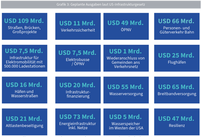 In den USA hat der Senat jüngst ein Infrastrukturgesetz im Volumen von einer Billion US-Dollar beschlossen3. Dieser Betrag liegt zwar deutlich unter dem vom Weißen Haus vorgelegten ursprünglichen Budget von zwei Billionen US-Dollar, fand jedoch parteiübergreifend ungewöhnlich breite Zustimmung. Grafik 3 stellt einige in dem Gesetz enthaltene Infrastrukturvorhaben dar. Wir rechnen in der Folge mit einer deutlichen Belebung der Rohstoffnachfrage in den Vereinigten Staaten.