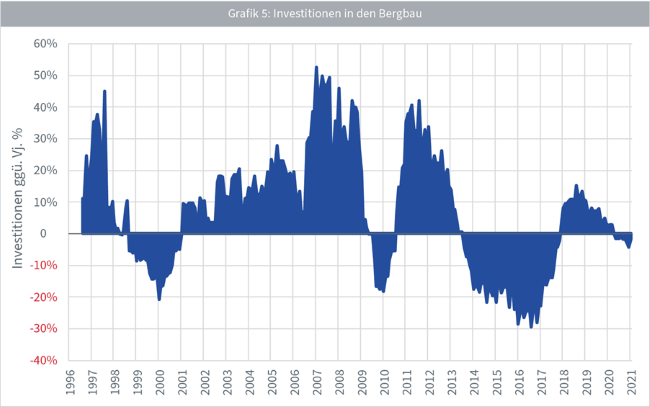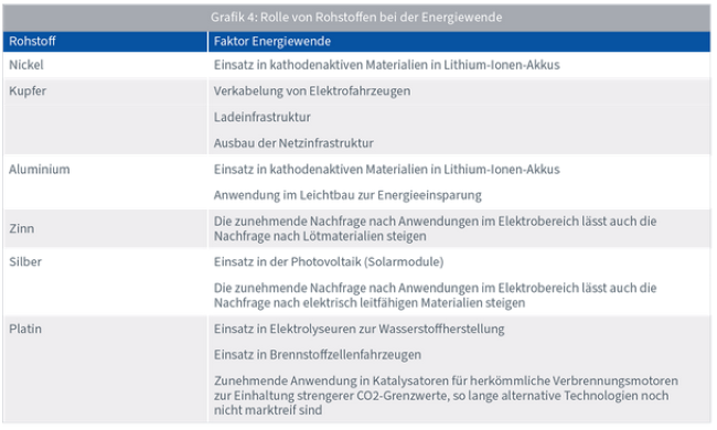 Einerseits ist klar, dass bestimmte Rohstoffe im Zuge der Energiewende vermehrt benötigt werden. Andererseits ist noch unklar, ob diese Rohstoffe auch in ausreichenden Mengen bereitgestellt werden können. Die Investitionen in den Bergbau sind in den letzten Jahren gesunken. In Anbetracht der langen Vorlaufzeit von der Investitionsentscheidung bis zur Steigerung der Produktion eines Bergwerks könnten zumindest mittelfristig Lieferengpässe entstehen.