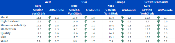 Im 4. Quartal 2022 erholten sich die Bewertungen aufgrund der positiven Entwicklung der Märkte auf breiter Front. Nebenwerte verzeichneten den größten Anstieg mit +1,7 bei globalen und europäischen Aktien und +2,2 bei US-Aktien. Die europäischen Märkte und die Schwellenmärkte bleiben recht günstig, was dazu führt, dass auch die Faktoren günstig sind. Der Wert der Schwellenmärkte wird derzeit mit einem Kurs-Gewinn-Verhältnis von 4,9 bewertet.