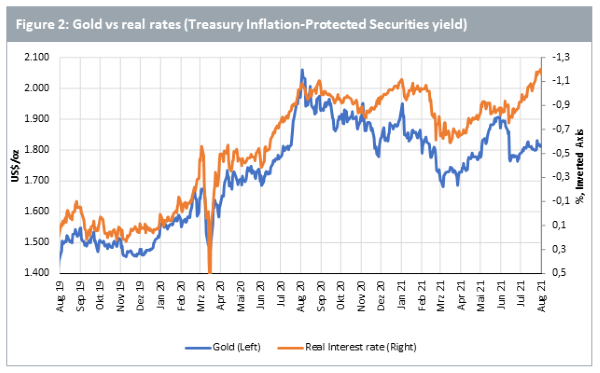 Unserer Ansicht nach wird Gold, wenn es sein traditionelles Verhalten wiedererlangt, vom heutigen Niveau steigen und dem Gegenwind moderat steigender Staatsanleiherenditen und einer leichten Inflationsabkühlung entgegenwirken. Das seltsame Verhalten von Gold in letzter Zeit wird auch durch die Abkehr von den Realkursen in den letzten Monaten deutlich (Abbildung 2). Wie wir in der Vergangenheit gesehen haben, werden diese kurzfristigen Abgänge jedoch häufig korrigiert (z. B. im November 2019 und November 2020).