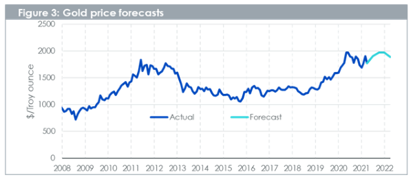 Mithilfe unseres Modellrahmenwerks, erläutert in unserem Blogbeitrag „Gold: how we value the precious metal”, stellen wir eine Prognose für den Goldkurs bis zum dritten Quartal 2022 bereit. Dieser Ausblick beinhaltet eine Konsensansicht zu den makroökonomischen Inputs für unser Modell, basierend auf einer Umfrage unter Ökonomen von Bloomberg im Juli 2021.