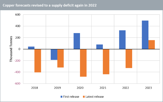 Nehmen wir das Beispiel von Kupfer. Die erste Prognose der International Copper Study Group (ICSG) für die Kupferbilanz 2022 (Nachfrage abzüglich Angebot), die im Oktober 2021 erstellt wurde, ging von einem beträchtlichen Überschuss von 328 000 Tonnen aus. Ihre letzte Prognose (vom 19. Oktober 2022) geht von einem Defizit von 328 Tausend Tonnen im Jahr 2022 aus. Nach den bisherigen Revisionen zu urteilen, wird ihre Prognose für das Jahr 2023 wahrscheinlich nach unten korrigiert. In ihren ersten Prognosen gingen sie davon aus, dass es keine Produktionsunterbrechungen geben würde. Doch wie wir in diesem Jahr beobachten konnten, können die Produktionsunterbrechungen sehr massiv sein.