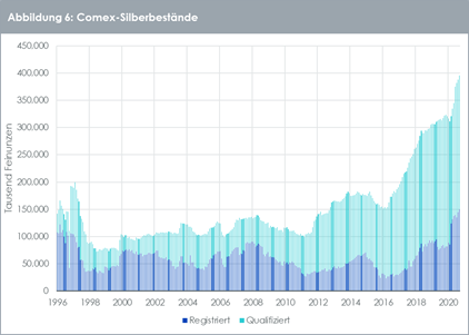 Der Silberbestand in Comex-Lagerhäusern war Anfang 2020 rückläufig, da die Beschaffung von Metall angesichts der durch COVID-19 verursachten betrieblichen Hindernisse erschwert wurde (einschliesslich des Lufttransports von Metall von Veredlern in Europa, was während des Lockdowns sehr schwierig war). Das Silberangebot an den Terminbörsen war jedoch immer reichlich und koppelte sich nicht so stark vom OTC-Kassamarkt ab, wie dies bei Gold der Fall war. In den letzten Monaten haben die Silberbestände an den Börsen ihren Aufwärtstrend wieder aufgenommen. Unseren Erwartungen zufolge wird sich dieser Trend fortsetzen und bei den Silberpreisen für einen gewissen Gegenwind sorgen.