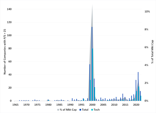 Von den späten 1960er bis zu den frühen 1990er Jahren war es sehr ungewöhnlich, ein Unternehmen mit einem KUV von über 25 zu finden. Wenn dies geschah, dann waren es ein oder zwei Unternehmen pro Jahr, und der Anteil an der gesamten Marktkapitalisierung, den sie repräsentierten, war vernachlässigbar.