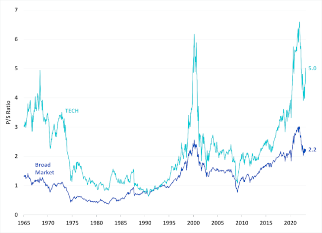 Abbildung 1: Eine Langzeitreihe zeigt 3 deutliche Spitzen im Kurs-Umsatz-Verhältnis von Tech-Aktien.