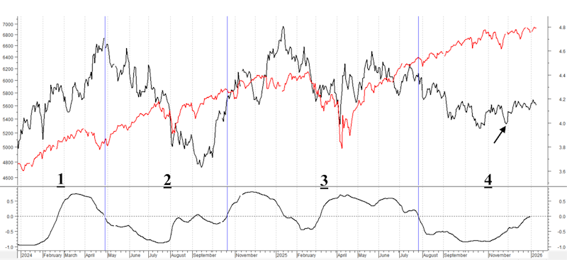 Tatsächlich steigt die Rendite der T-Note seit dem Tiefpunkt am 27. November (siehe schwarzer Pfeil) leicht an, wobei auch der S&P500 steigt. Dies hat zu einem Anstieg der Korrelation geführt, die nun an der Grenze zu einem positiven Wert liegt.